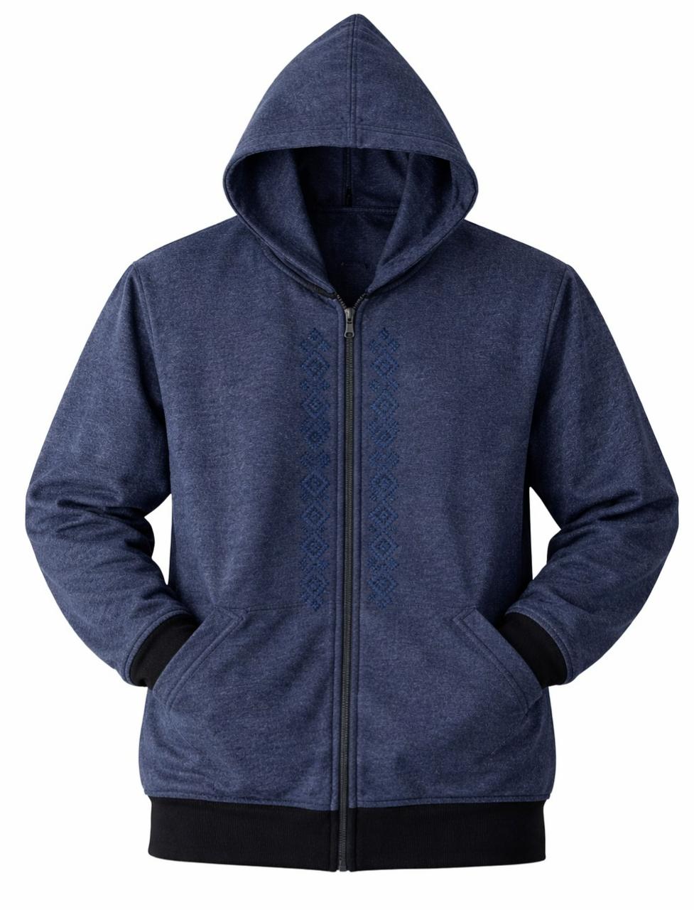 A blue jacket with blue-on-blue embroidery, simple from afar, special up close.